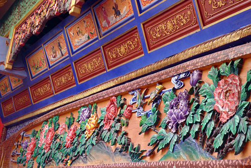 在整體外觀(guān)上,沿襲中國(guó)古戲臺(tái)建制,采用單層戲臺(tái)三面觀(guān)制,全木質(zhì)結(jié)構(gòu),四周雕梁畫(huà)棟,重檐歇山頂,檐角高挑,多面開(kāi)窗,建筑構(gòu)造沿襲傳統(tǒng)的全木制榫卯結(jié)構(gòu)。明清風(fēng)格雕刻裝飾藝術(shù),采用浮雕法對(duì)雀替及額枋進(jìn)行裝飾,觀(guān)賞性極強(qiáng)。