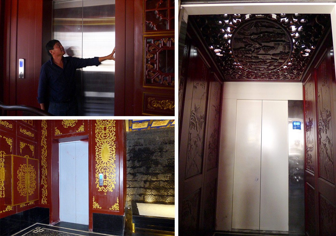 ↑首創(chuàng)性地在全木結(jié)構(gòu)建筑內(nèi)加入了電梯,地下停車(chē)場(chǎng)直達(dá)二層貴賓通道。電梯內(nèi)的裝飾均為全木設(shè)計(jì)。