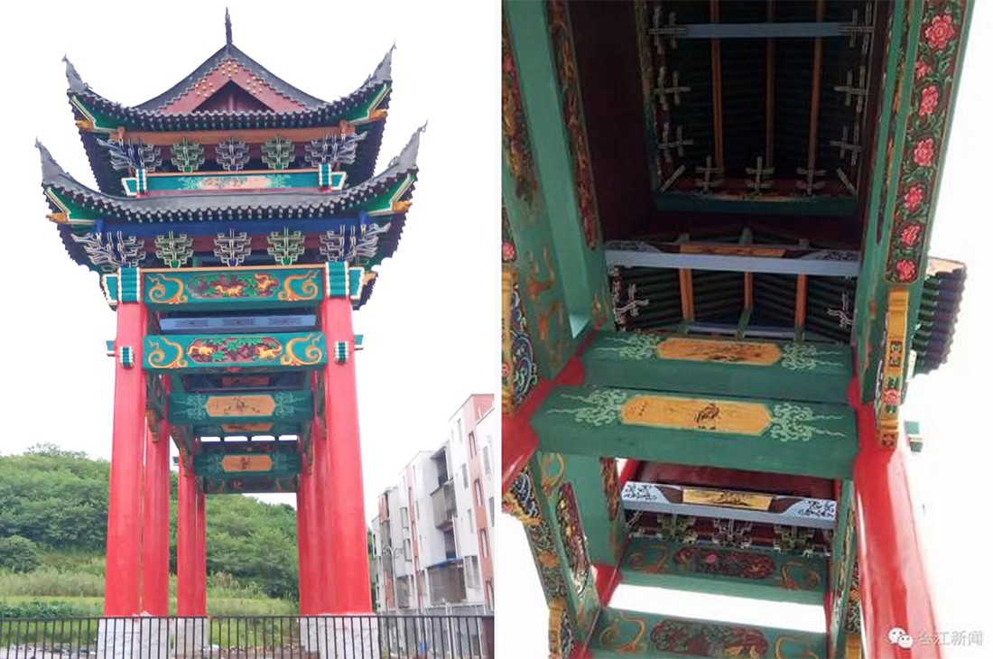 建成后的靈丹村牌樓側(cè)面 與 靈丹村牌樓施工后期,合江新聞報道圖片