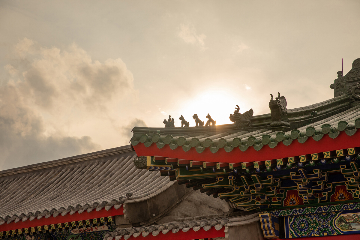 吾鄉(xiāng)島的屋面共有歇山、懸山、硬山三種形式,其中歇山是較高等級(jí)的屋面,用于中路的中軸建筑,為綠琉璃瓦,其余棟號(hào)均為黑活筒瓦硬、懸山屋面。