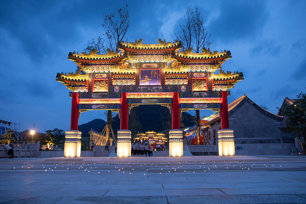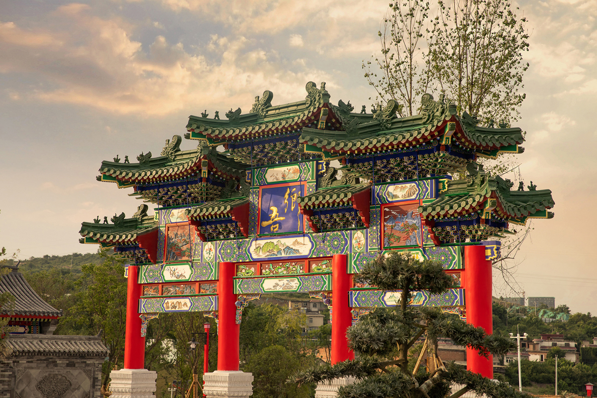 穿過聚財(cái)門,通過湖上的單孔石橋,就進(jìn)入了島上的中心廣場(chǎng),中心廣場(chǎng)的布局莊重大氣,兩座四柱七間牌坊矗立東西兩側(cè),牌坊立柱外套1.8米高石雕刻夾桿石,雕刻紋飾為傳統(tǒng)建筑中常用的“八達(dá)馬、連珠”等紋路;明樓花板雕刻“吾鄉(xiāng)”并飾金,左右次樓花板雕刻迎客松,寓意接納八方來客;花板之上為七踩昂翹斗栱;斗栱及龍門板、柱頭、梁、枋等構(gòu)件繪制“金線大點(diǎn)金旋子彩畫”;牌坊瓦面為綠琉璃瓦,并安置正吻、仙人指路、獅子、天馬、海馬等瑞獸。整個(gè)牌坊看起來莊重大氣又不失華麗。